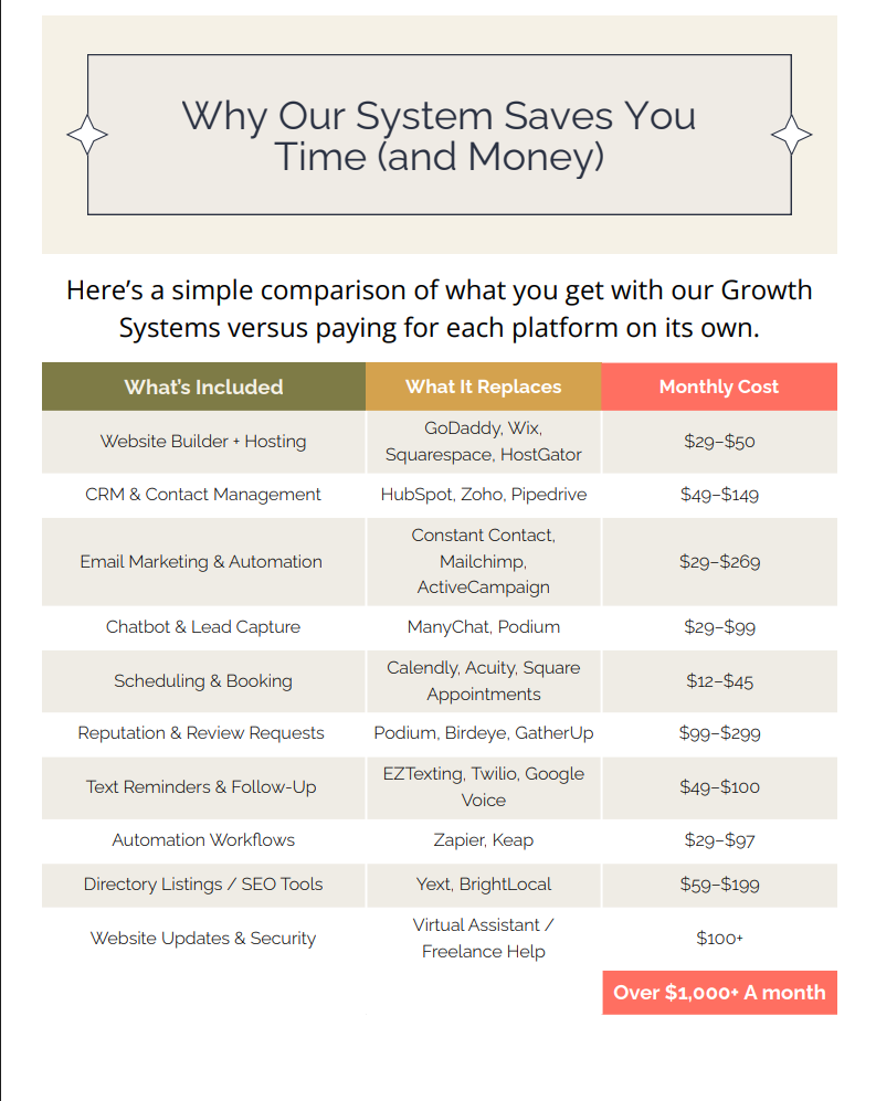 So I built a system that puts it all in one place. Your website, chatbot, automations, scheduling, emails, and reviews finally working together instead of against you. And the best part? It costs a fraction of what you’d spend juggling five different platforms.